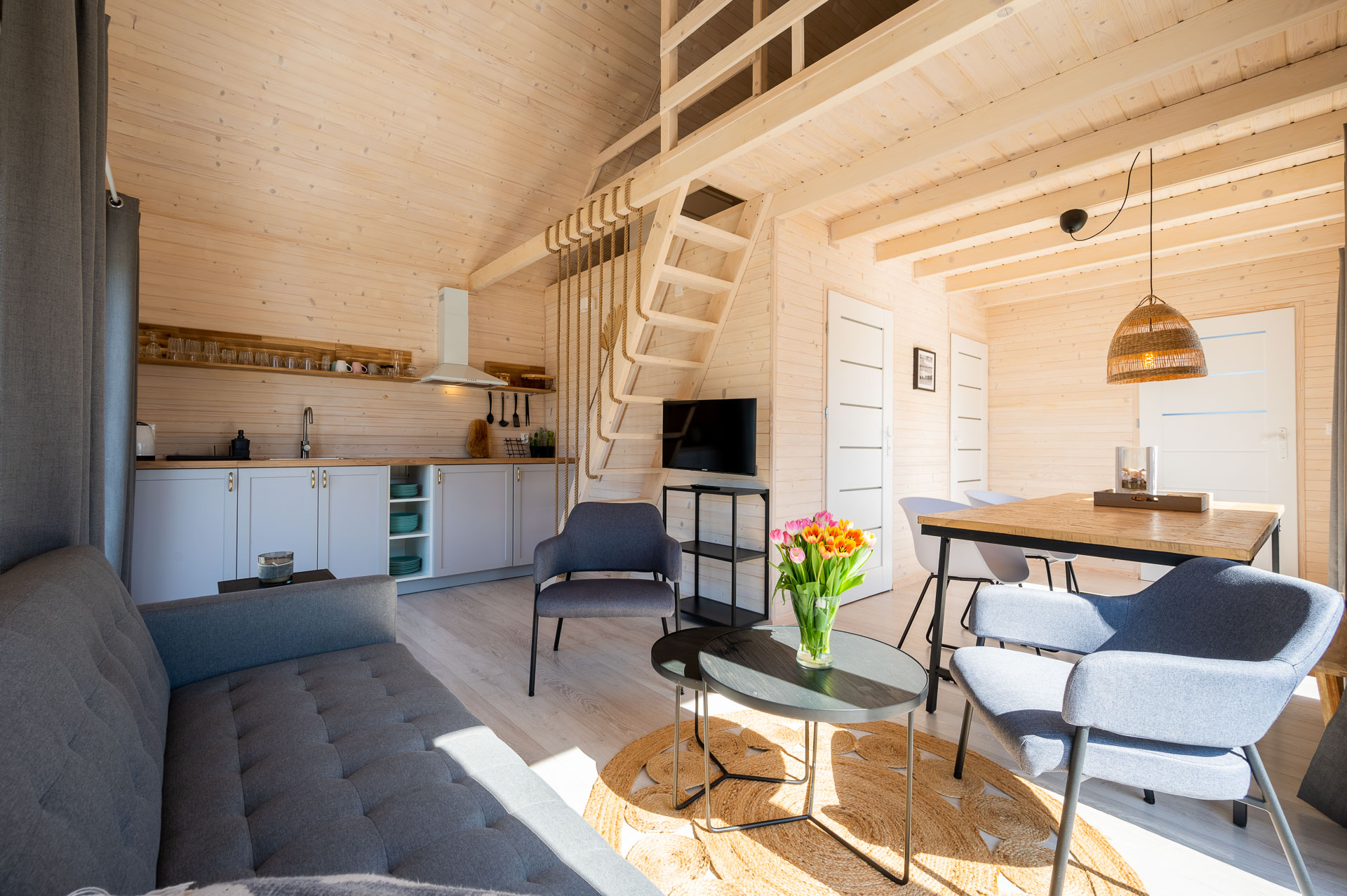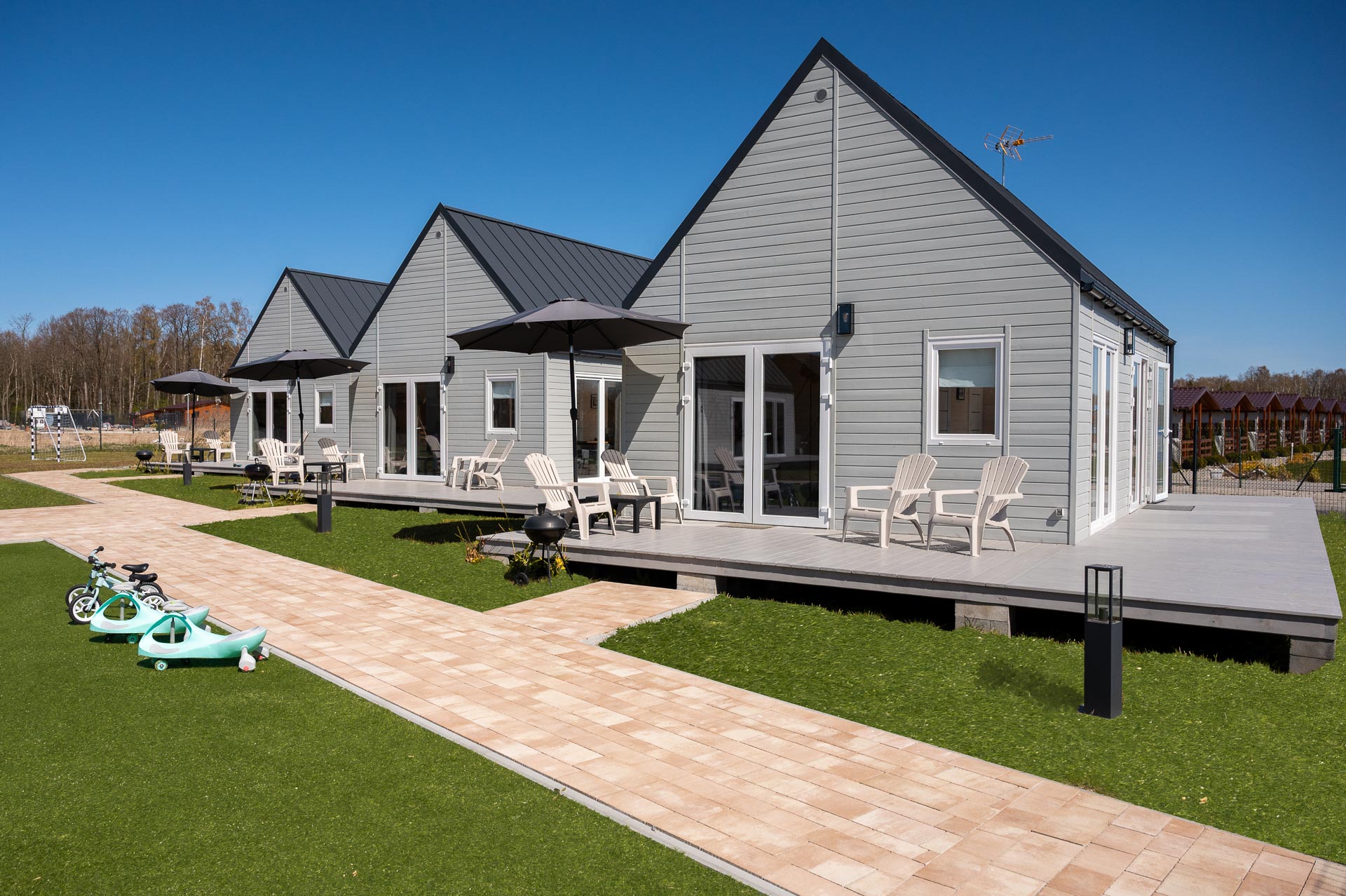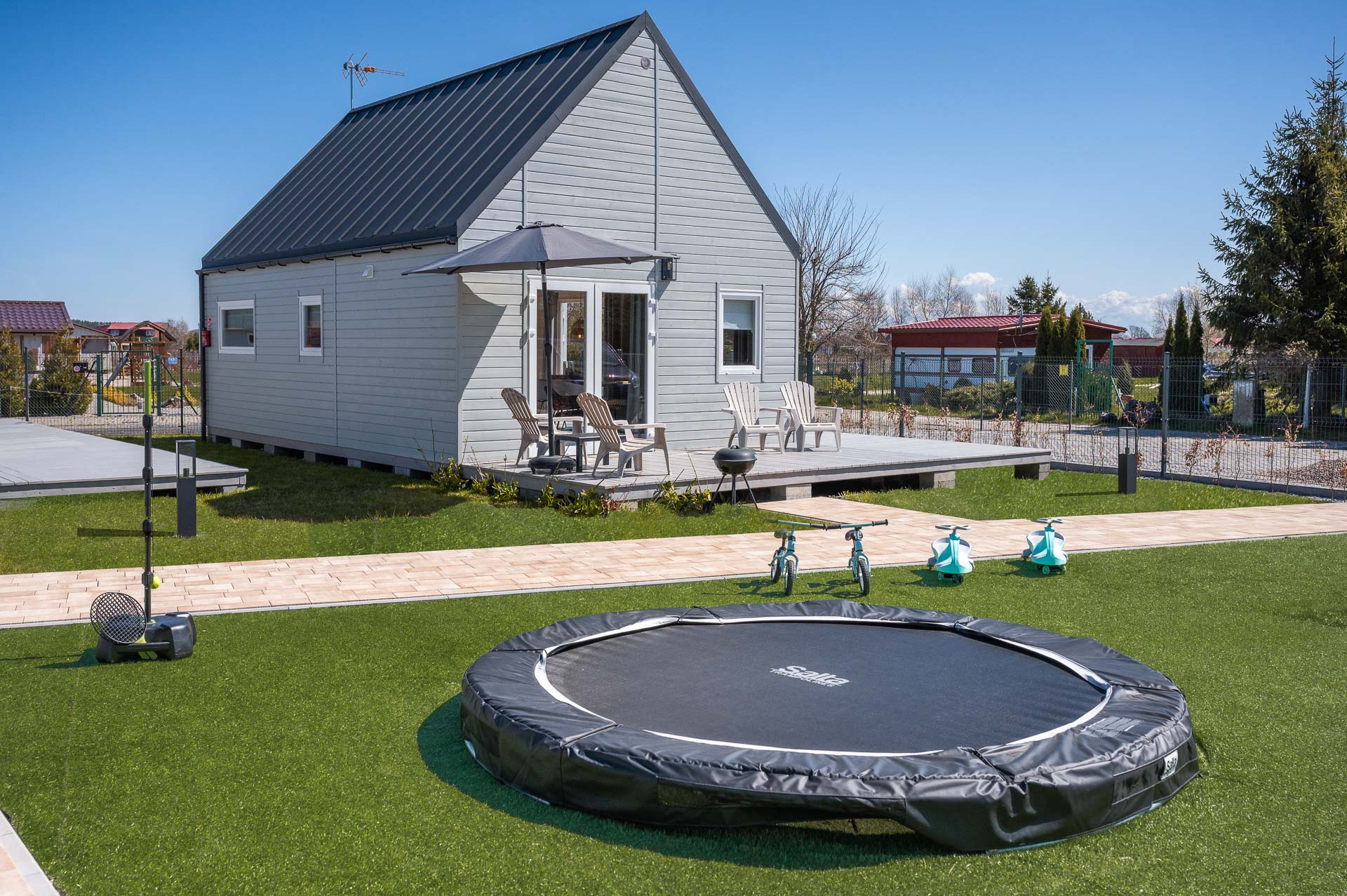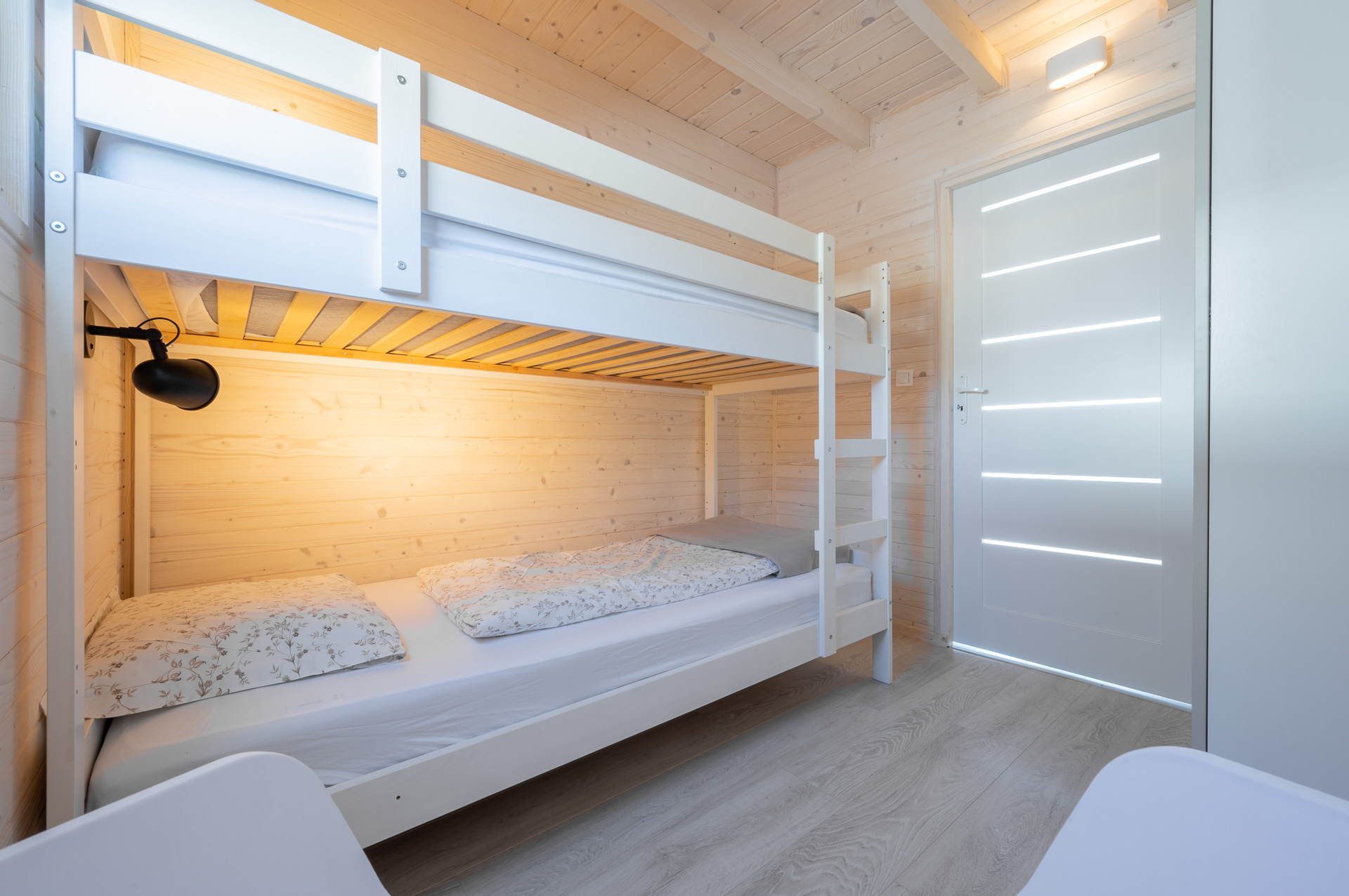 Oferujemy państwu pięć 6-osobowych domków. W każdym domku znajdują się trzy sypialnie – dwie na parterze (z łóżkiem małżeńkim i łóżkiem piętrowym) i jedna na piętrze (z łóżkiem małżeńskim).