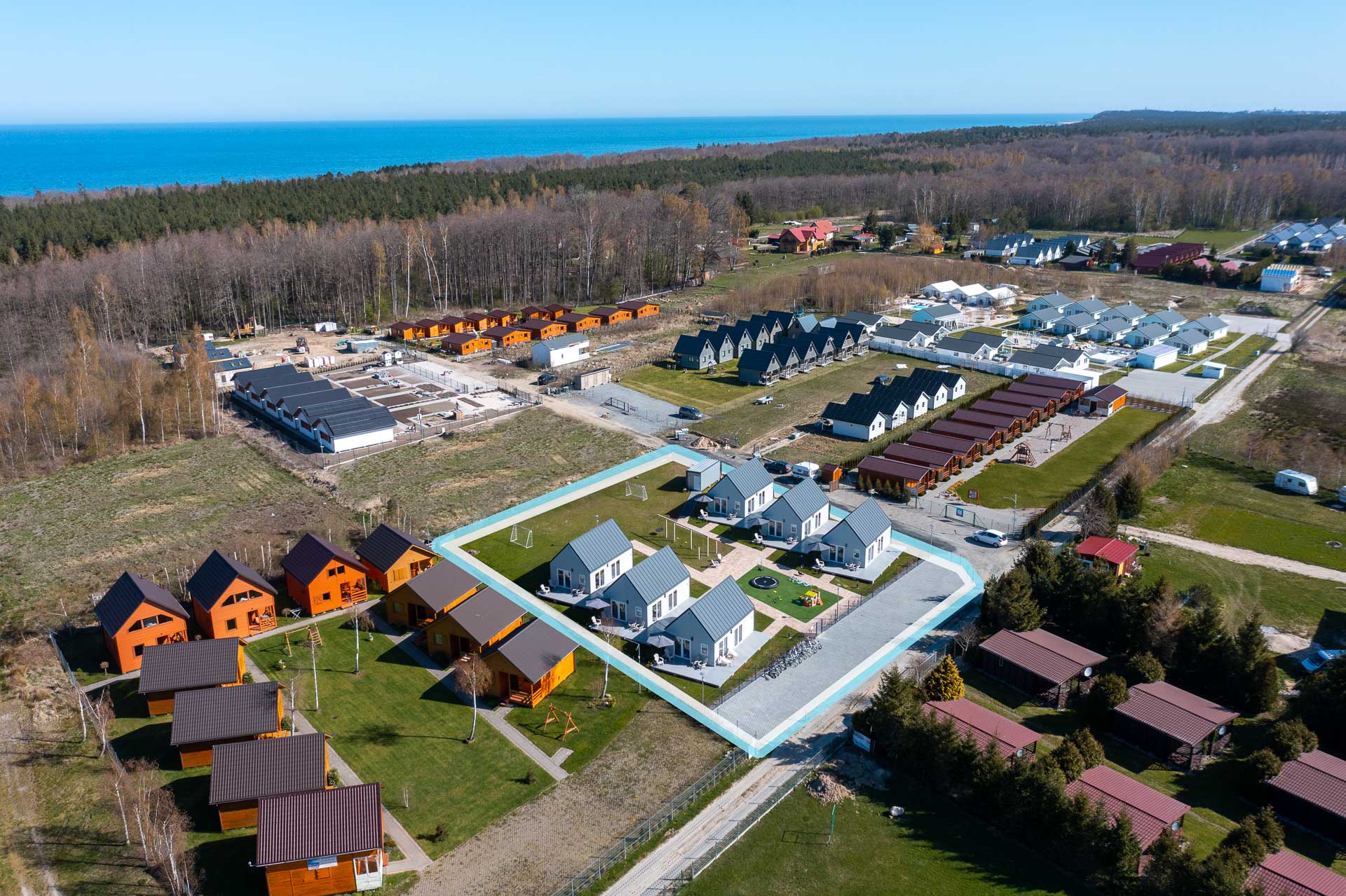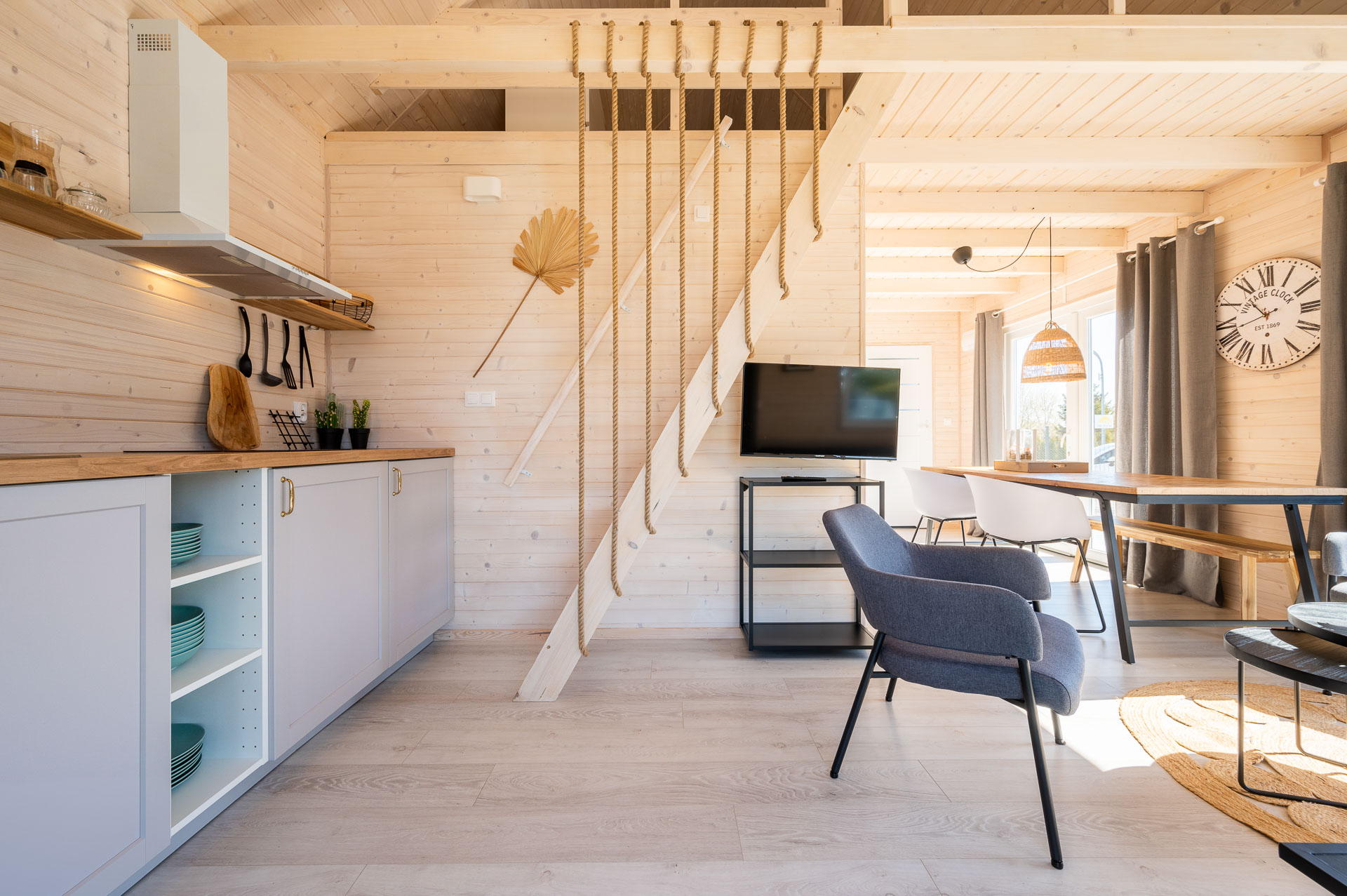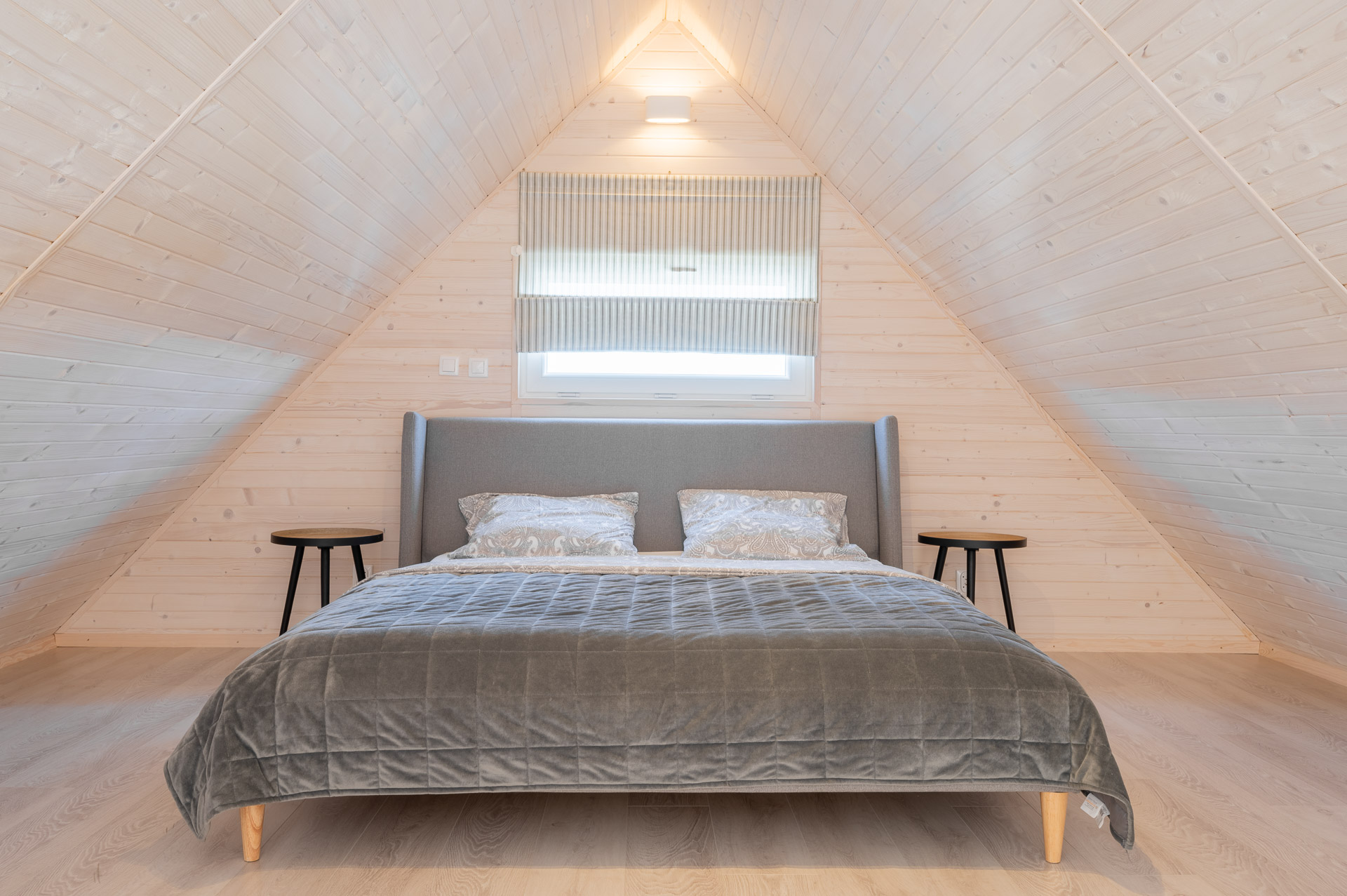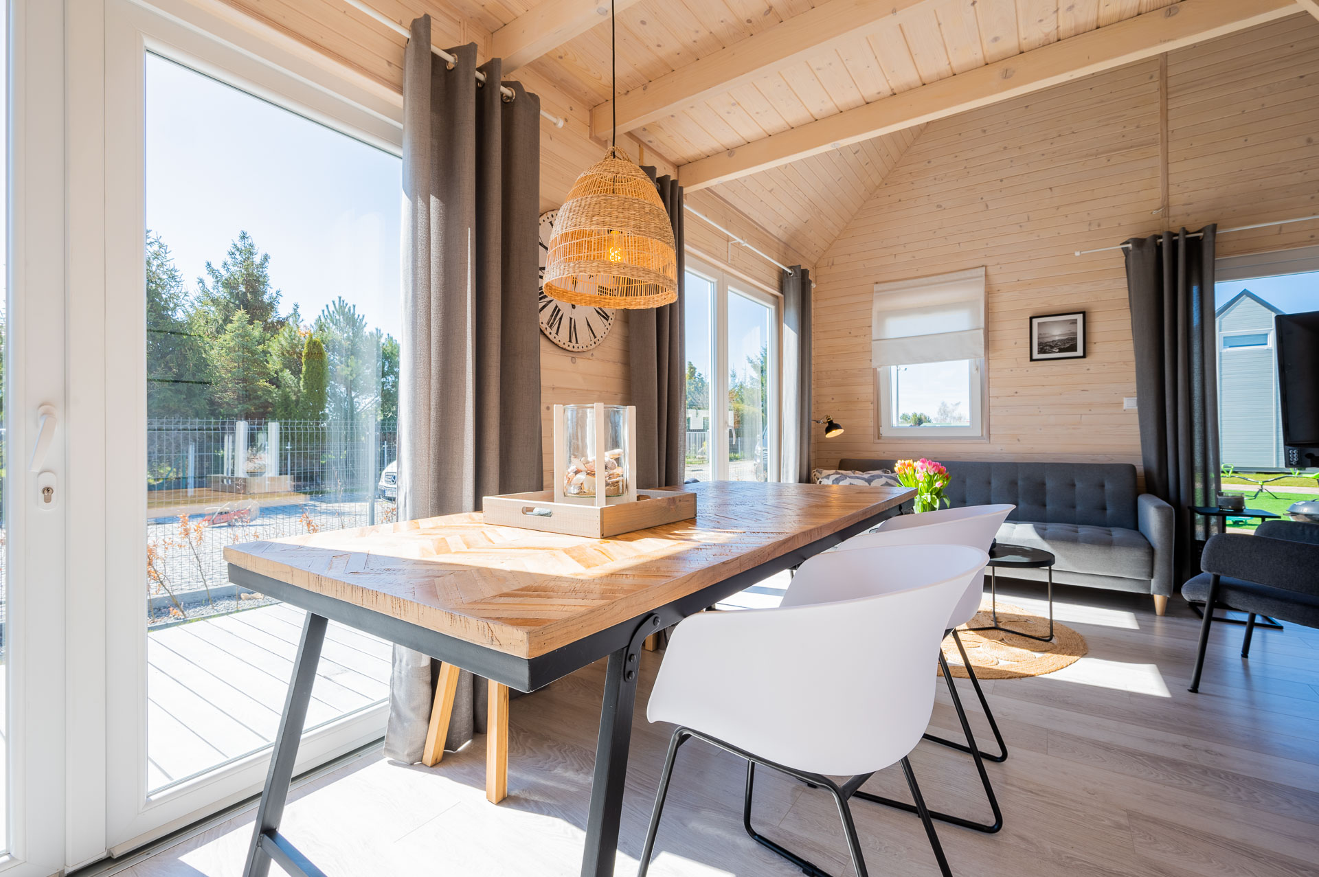 Oferujemy państwu pięć 6-osobowych domków. W każdym domku znajdują się trzy sypialnie – dwie na parterze (z łóżkiem małżeńkim i łóżkiem piętrowym) i jedna na piętrze (z łóżkiem małżeńskim).