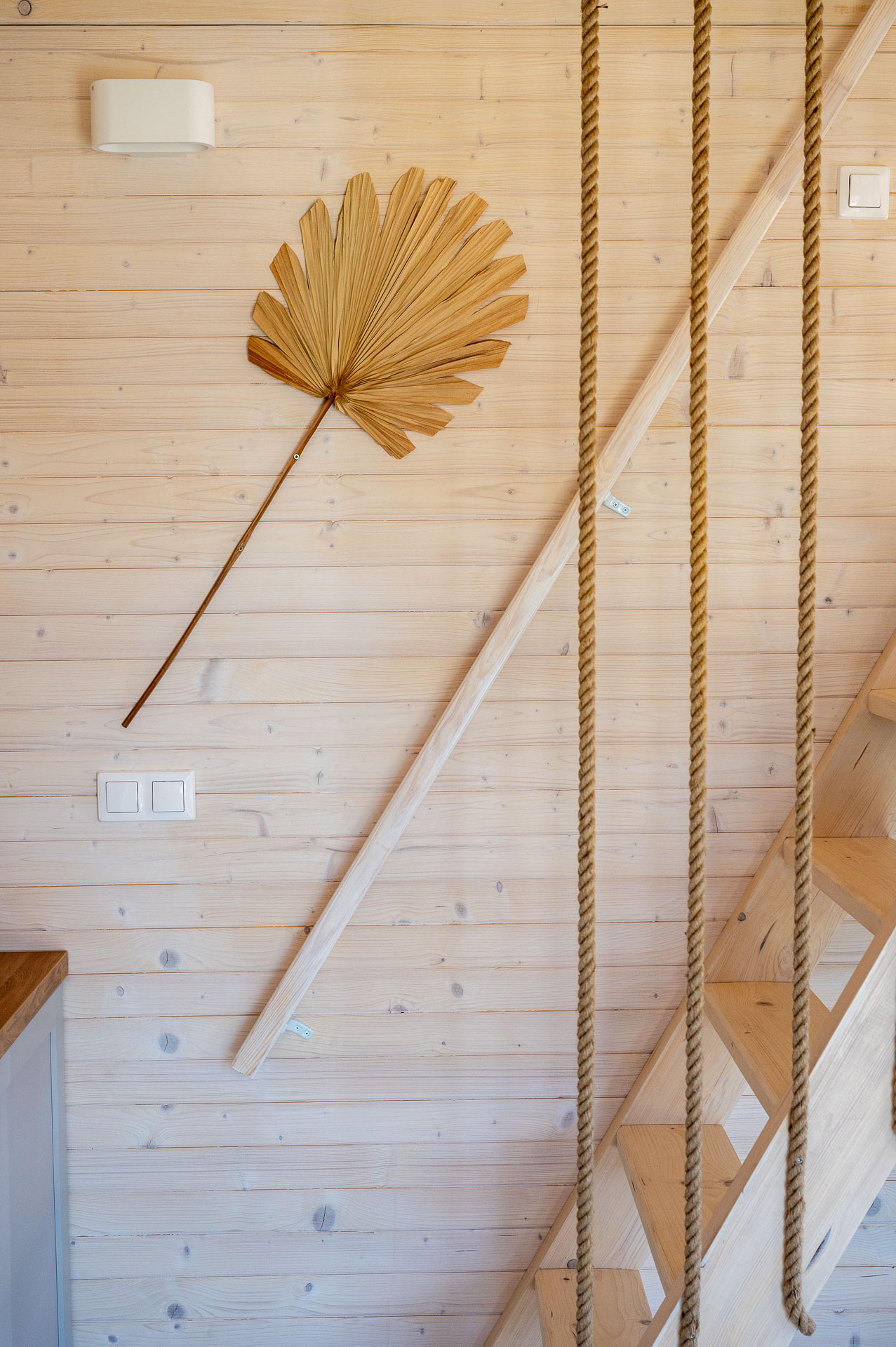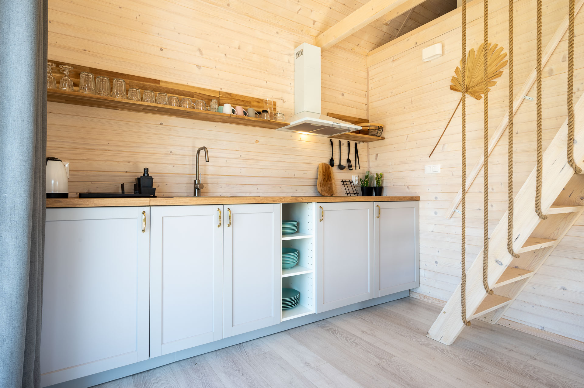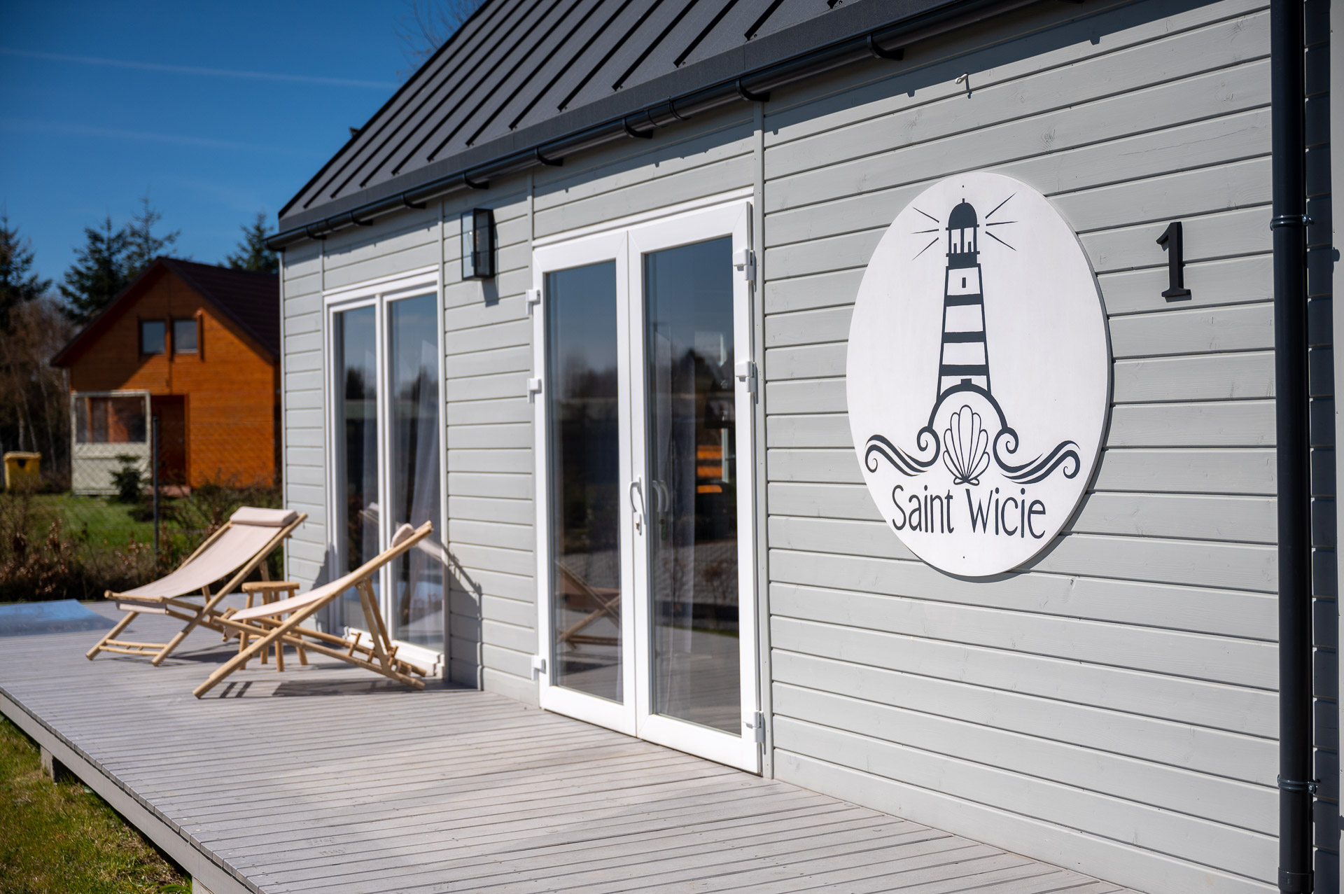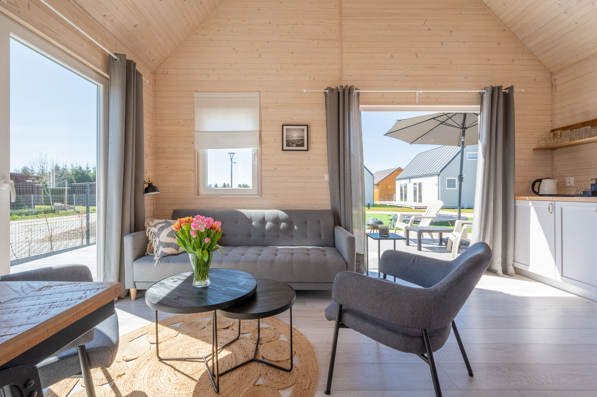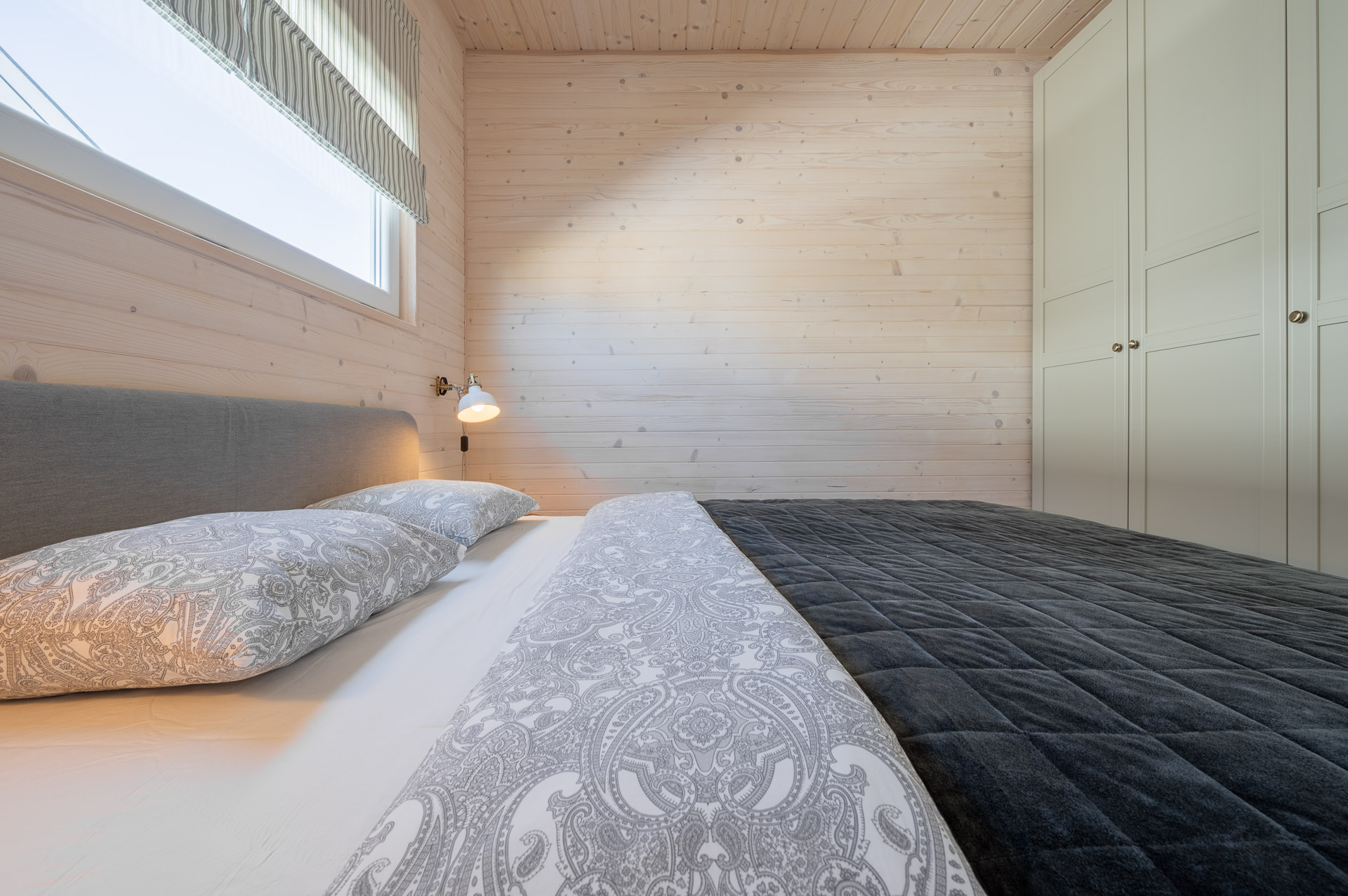 Oferujemy państwu pięć 6-osobowych domków. W każdym domku znajdują się trzy sypialnie – dwie na parterze (z łóżkiem małżeńkim i łóżkiem piętrowym) i jedna na piętrze (z łóżkiem małżeńskim).