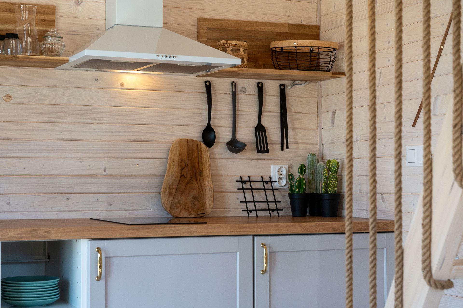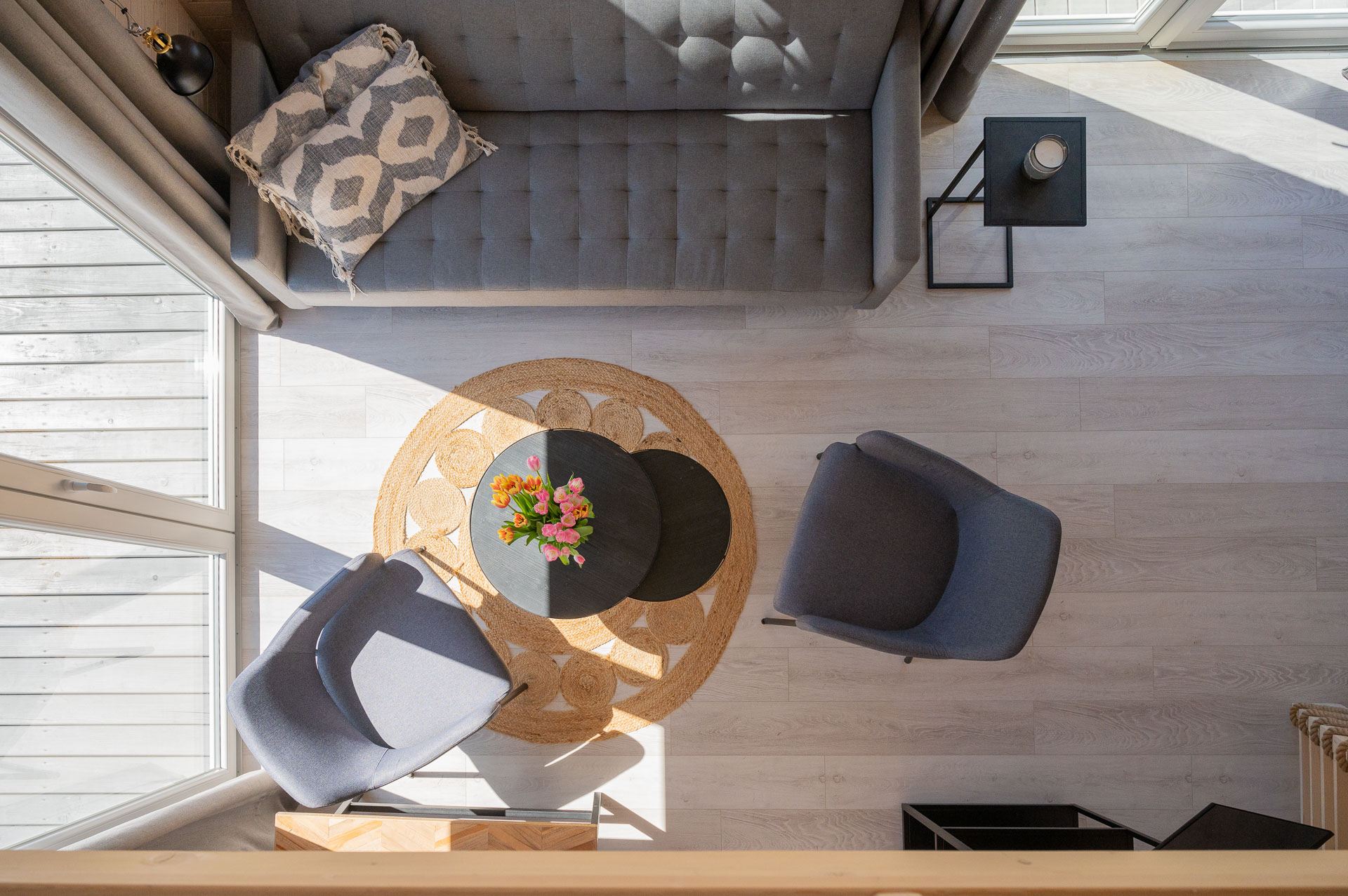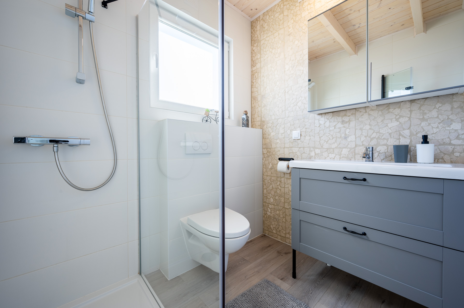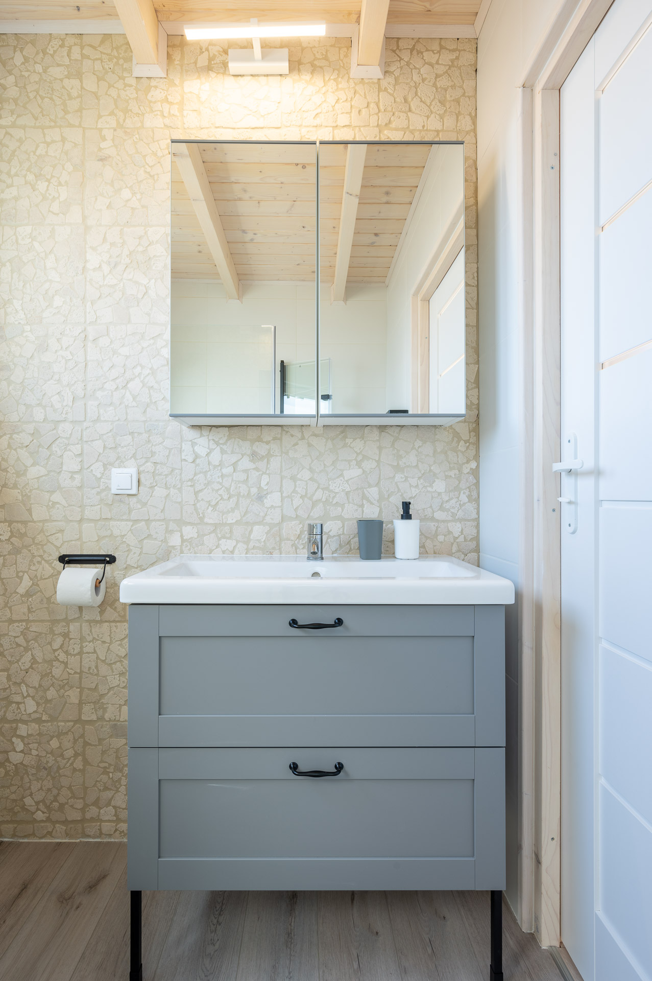 Oferujemy państwu pięć 6-osobowych domków. W każdym domku znajdują się trzy sypialnie – dwie na parterze (z łóżkiem małżeńkim i łóżkiem piętrowym) i jedna na piętrze (z łóżkiem małżeńskim).