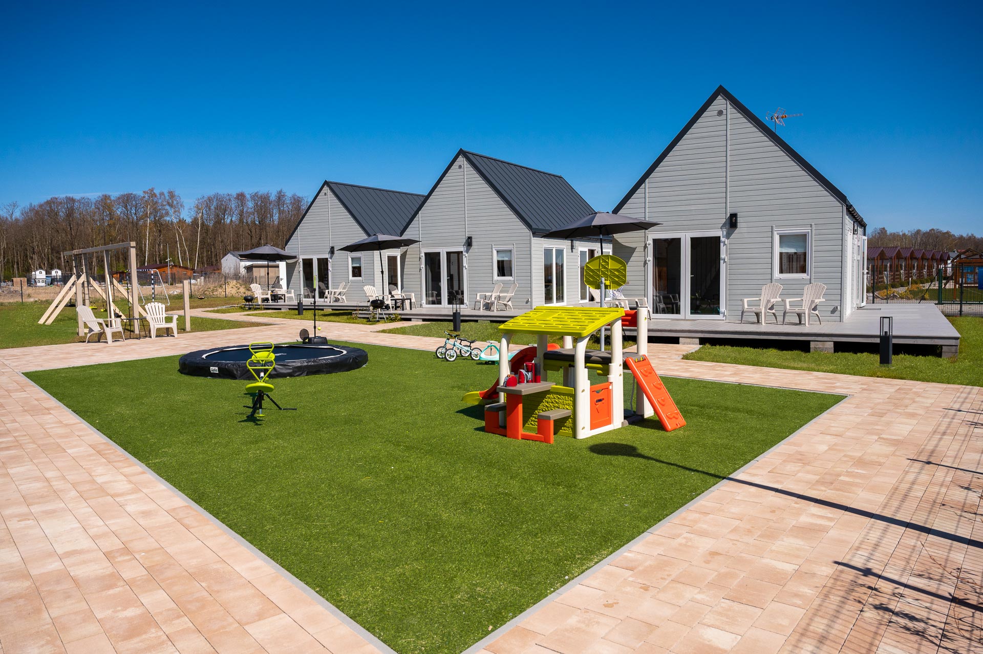 W każdym domu znajduje się salon z aneksem kuchennym, trzy sypialnie, łazienka i duży taras.
